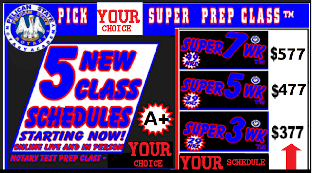 1. New Highlights on STATUTES IN the 2025 Louisiana Notary Study Guide.....2. "SUPER7WK LIVEONLINELEARNING" Online & Classroom SUPER 7Wk 49 HOUR FULL COURSE -5Wk 39 HOUR-3Wk 29 HOUR REFRESHER COURSES NOTARY TEST PREP Classes START DATES: CALL US.